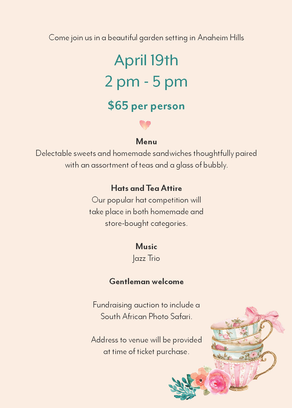 Enjoy delectable sweets and homemade sandwiches thoughtfully paired with an assortment of teas and a glass of bubbly. Hats and tea attire is encouraged. Our popular hat competition will take place in both homemade and store-purchased categories. Background music will be provided by a jazz trio from Chapman university. Gentlemen and ladies are welcome. Our live auction fundraiser will feature a South African Photo Safari.